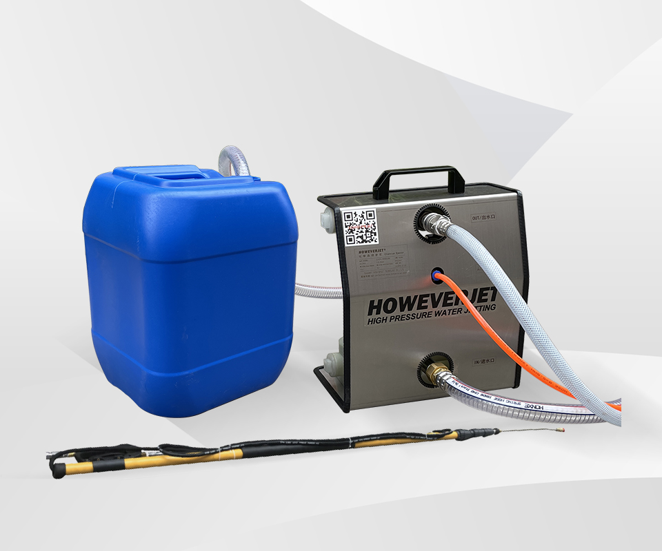 HOWEVERJET chemical jetter is equipped with a 50m discharge hose and a chemical telescopic lance (7m total length).